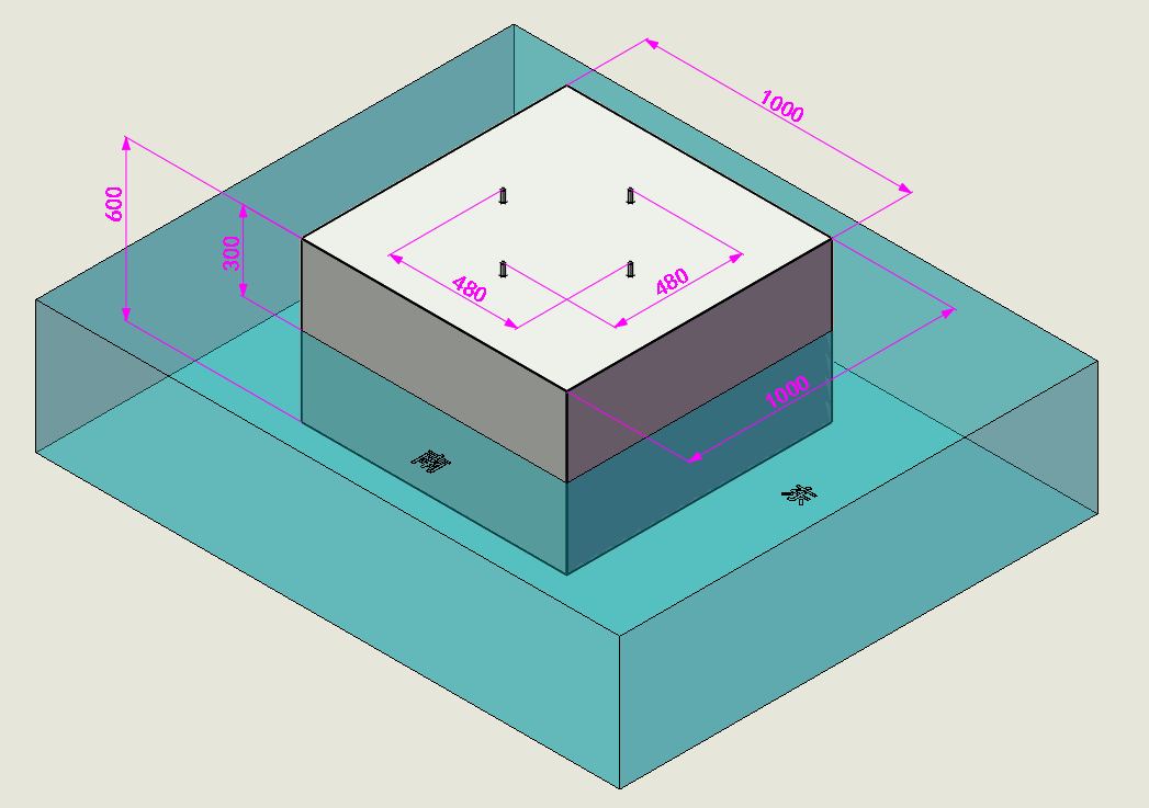 3、按下圖澆筑混凝土地基,外形尺寸(長X寬X高)=100CM*100CM*60CM,露出地面高度30CM,預(yù)埋四顆M12*120mm鐵膨脹螺栓,螺栓露出地基高度30mm左右,中心距640X640mm,需保持螺栓垂直,不能有歪斜情況。