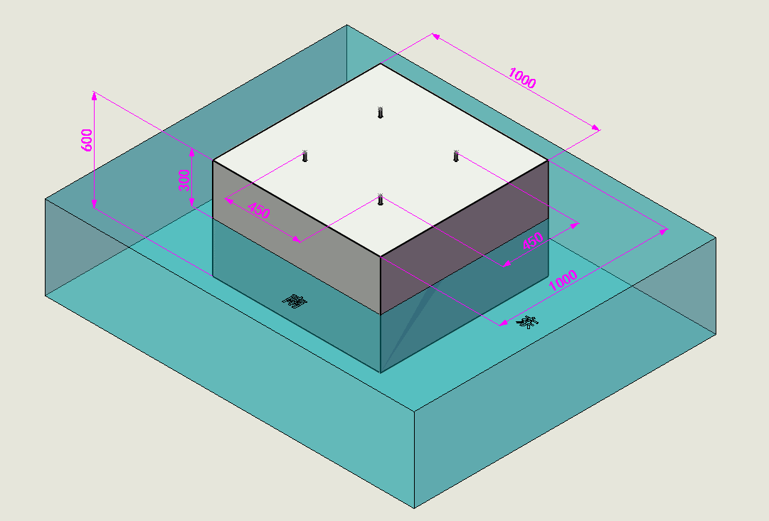 3、按下圖澆筑混凝土地基,外形尺寸(長(zhǎng)X寬X高)=100CM*100CM*60CM,露出地面高度30CM,預(yù)埋四顆M12*120mm鐵膨脹螺栓,螺栓露出地基高度30mm左右,中心距450X450mm,需保持螺栓垂直,不能有歪斜情況。