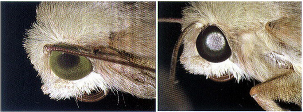 黃色波段燈利用昆蟲復(fù)眼的綠-黃光感受器的生物學功能。夜出型蛾類的復(fù)眼在白天為明適應(yīng)狀態(tài)(左上圖),夜間為暗適應(yīng)狀態(tài)(右上圖)。