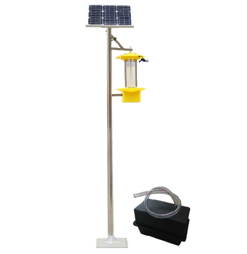 太陽能殺蟲燈是利用太陽能電池板作為用電來源,其將白天太陽能發(fā)的電貯存起來,晚上放電給殺蟲燈具,引誘害蟲撲向燈的光源,光源外配置高壓擊殺網(wǎng),殺死害蟲,使害蟲落入專用的接蟲袋內(nèi),達到滅殺害蟲的目的。